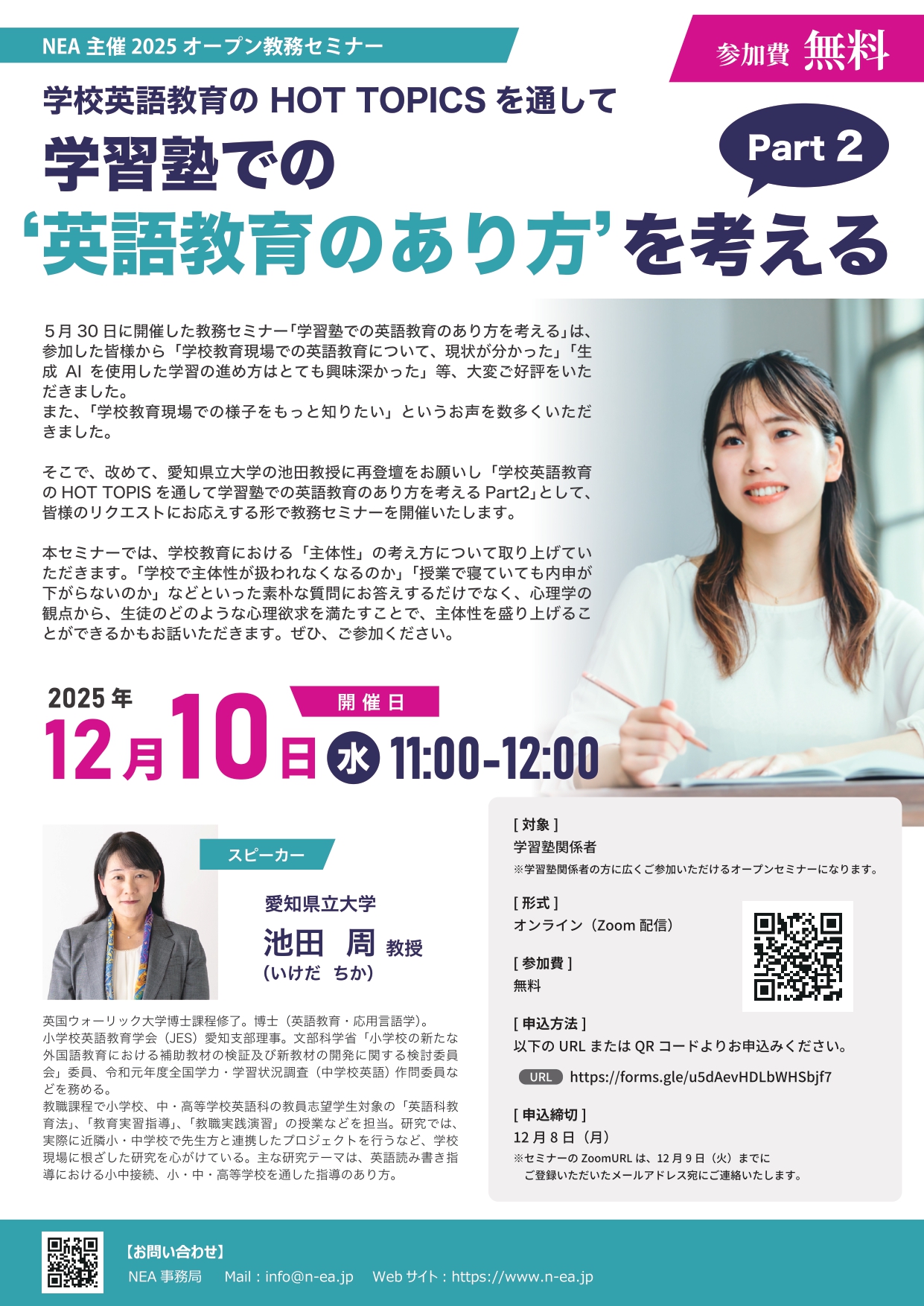 5月30日に開催した教務セミナー「学習塾での英語教育のあり方を考える」では、参加した皆様から「学校教育現場での英語教育について、現状が分かった」「生 成AIを使用した学習の進め方はとても興味深かった」等、大変ご好評をいただきました。